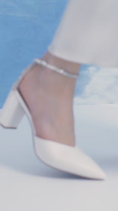 Devoted to the romantic, the pointed block Anna heel features a flattering v-cut and slim strap of elegantly placed diamantés.